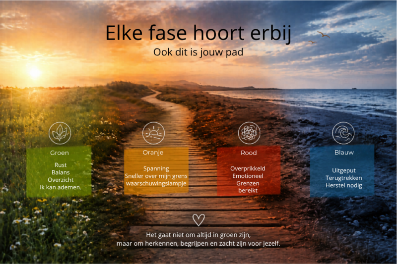 En hoe beter je leert luisteren naar je signalen in geel en oranje, hoe makkelijker je de weg terugvindt. Niet door harder te duwen, maar door zachter te worden.
